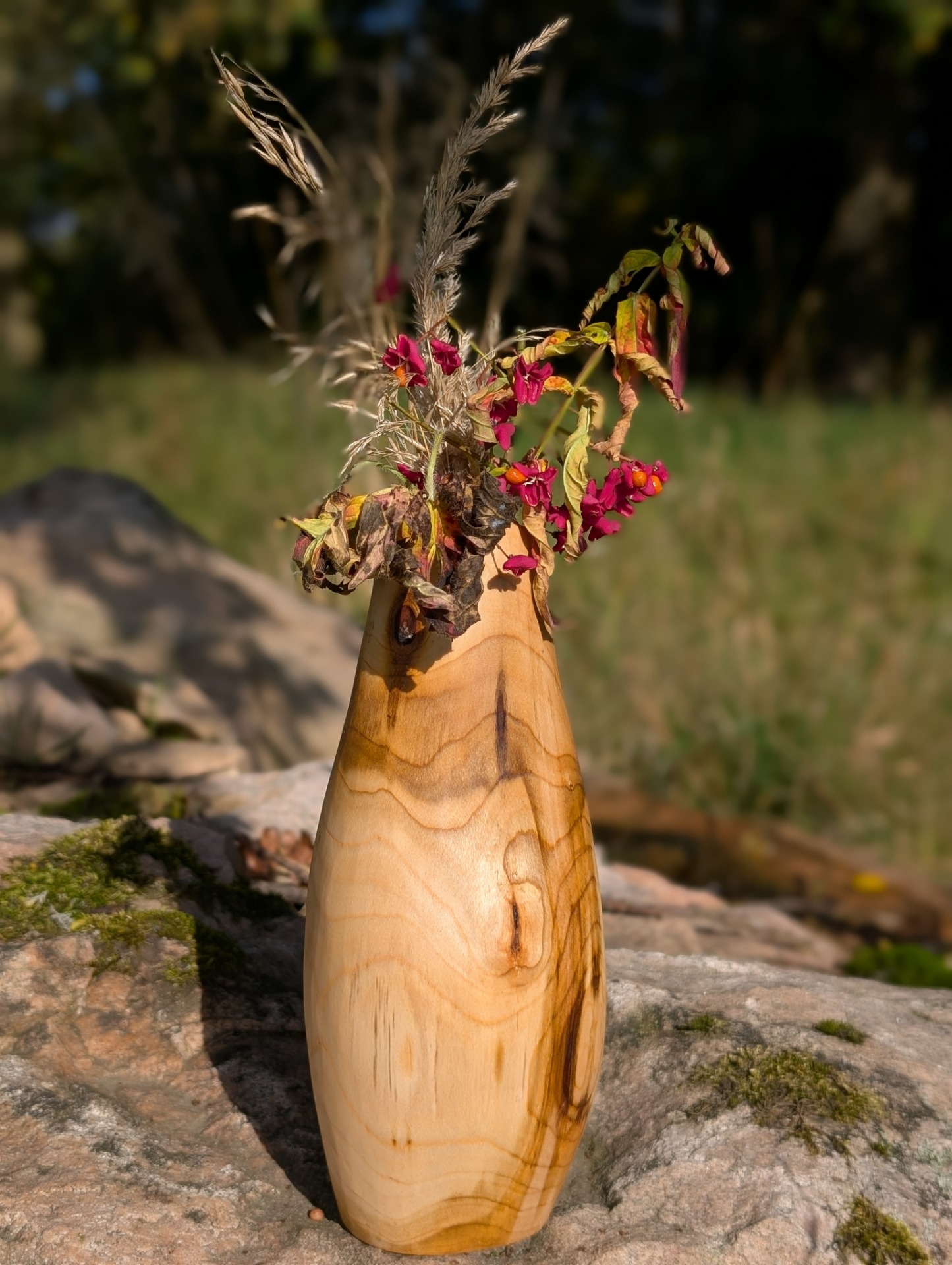 Tato váza nese hluboké odstíny jejího dřeva a tichou energii lesa. Je určena pro sušené květiny, trávy nebo větve — pro vše, co má svůj vlastní příběh.