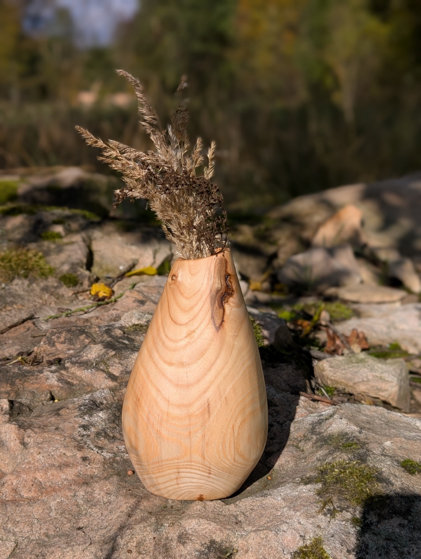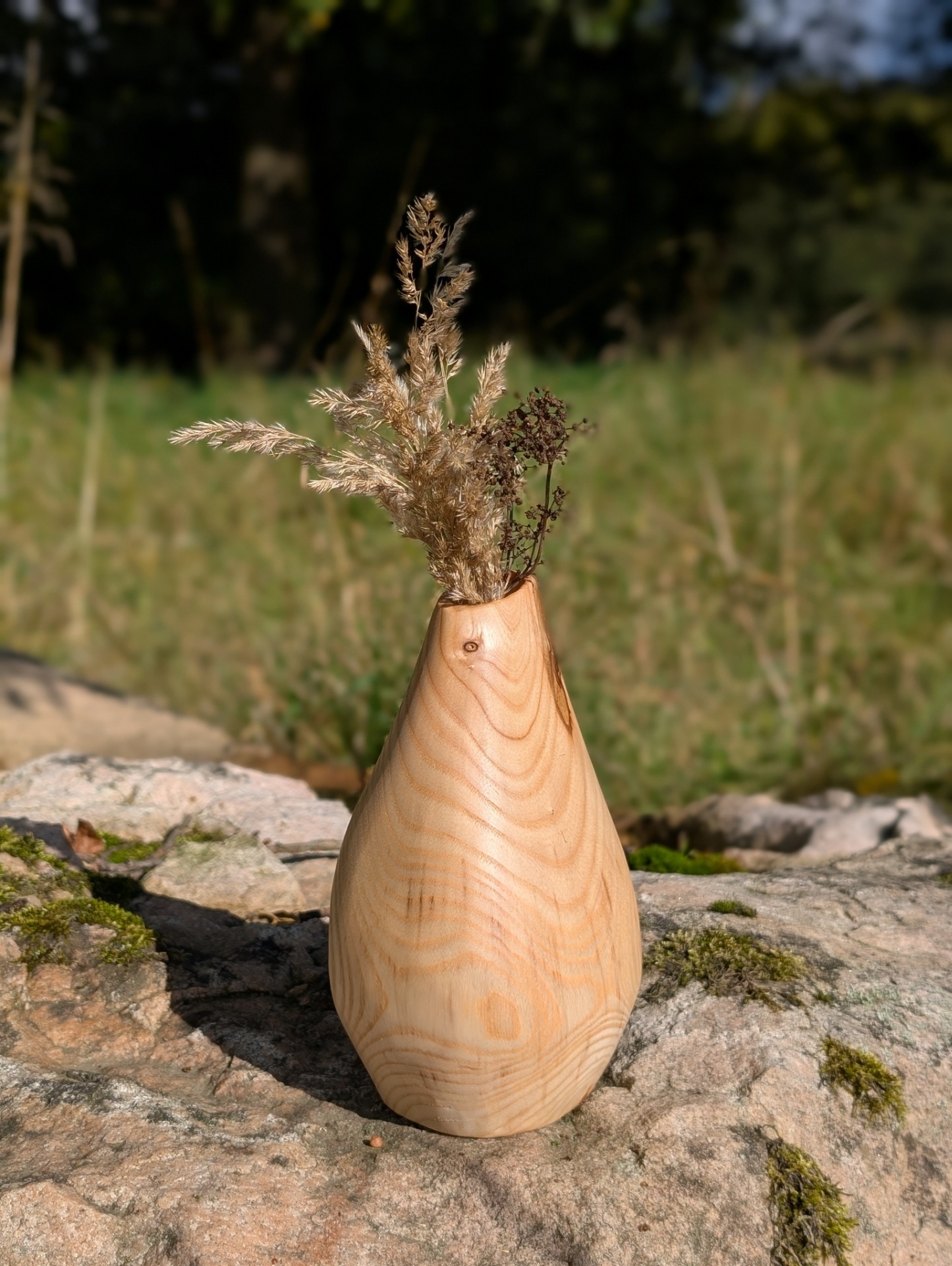 Střemcha je strom ticha, hranice lesa a vody. Roste tam, kde se krajina láme do tajemství. Tato váza nese její jemnou, ale divokou energii – tmavé tóny dřeva, živou kresbu a klid, který se nedá napodobit.